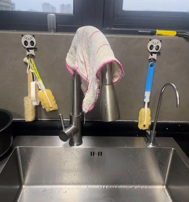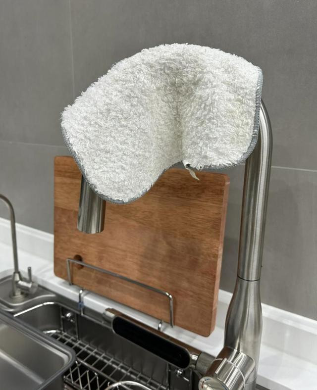 后来我也学会了:用一块厨房纸代替抹布,折叠得平整一些,锅盖放上去不会滑,用完后还可以拿来擦锅,一举两得。 第二、抹布收纳,甩掉繁琐! 以前我用架子、挂钩把抹布一通乱挂,既不美观也不方便。 我妈的妙招,则是将抹布直接挂在水龙头旁,就那么一搭,沥水通风,随时都能用。不用装架子,不用费劲找存放的位置,让抹布自然干燥,还省了不少空间。