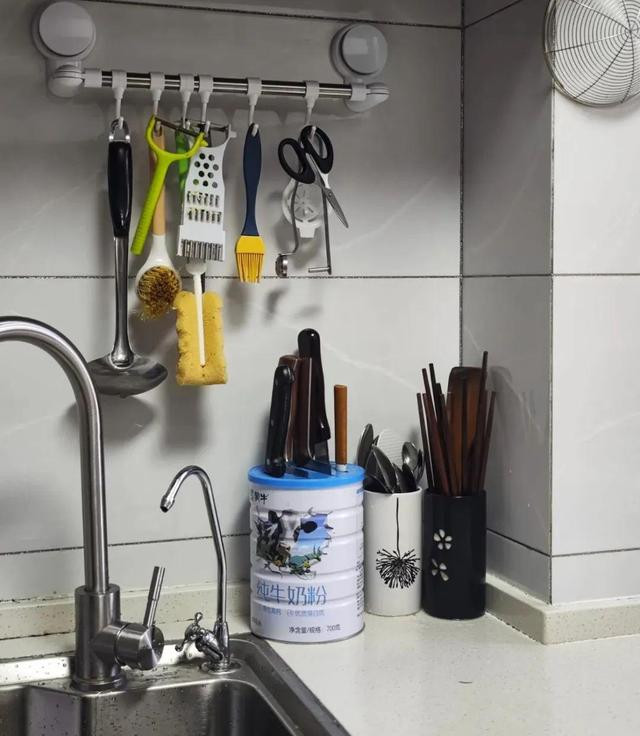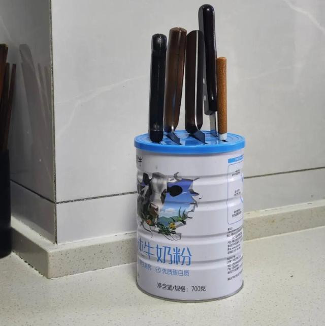 第六、刀具的收纳! 网上很火的刀架,实际上用起来并不方便,还占空间。我妈用的,是废旧的奶粉桶,改造成了简单的刀具收纳箱。