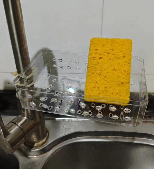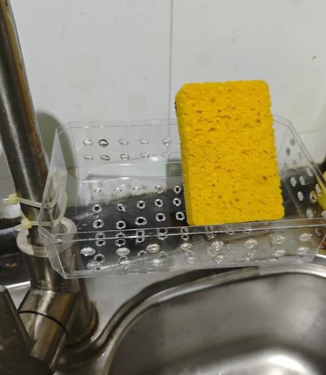 第五、海绵和钢丝球的收纳! 海绵和钢丝球放在普通的盒子里,底部不透气,容易潮湿发霉,甚至久了,还会滋生异味。 我妈用的办法,是用废旧的塑料盒子,自己戳洞:用金属棒在火上烧热,然后用扎带绑在水龙头上,戳出排水透气的小洞。