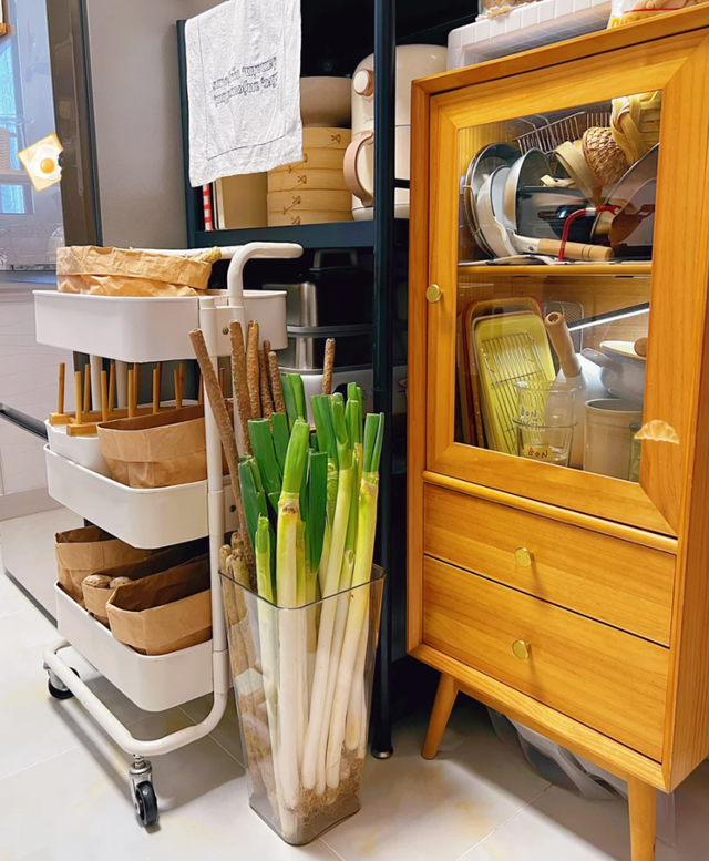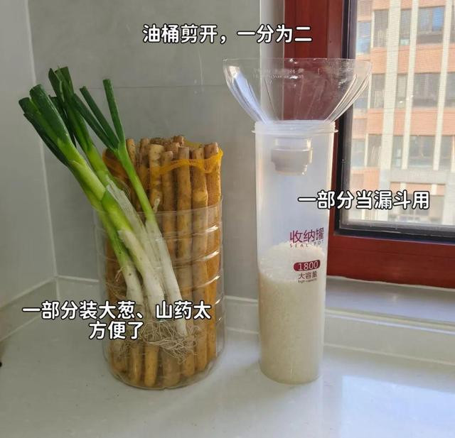 第八、大葱山药的收纳! 长条形的葱、山药,总是堆在角落,看着乱糟糟。 我妈的妙招,是拿个大油桶,对半一切,里面装着长条蔬菜,整齐又方便拿取。