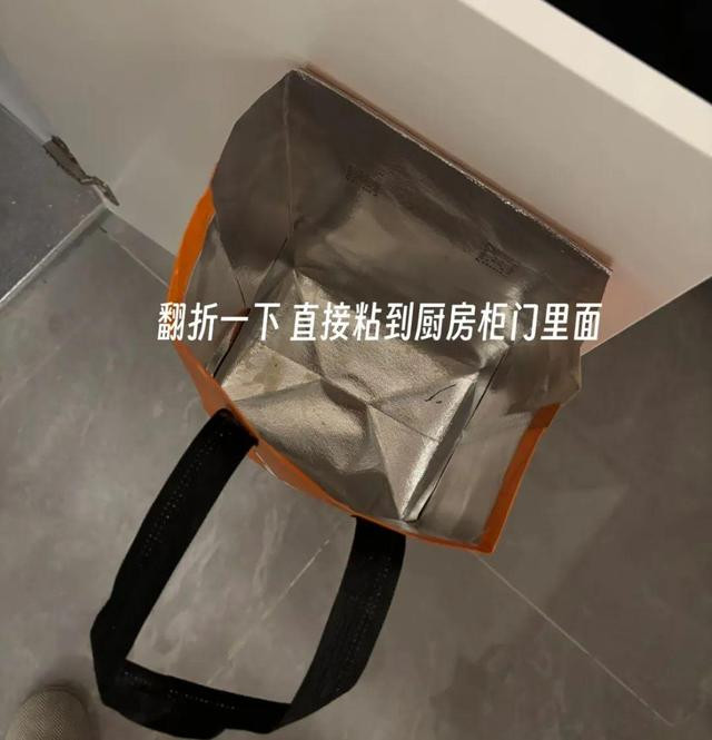 第十、塑料袋的“整齐粘贴法” 我自己也爱收集塑料袋,拿到角落堆成一堆,乱七八糟。 我妈在柜门内侧粘了两个大胶带,把塑料袋翻折后粘在里面,分类存放。大塑料袋用一条,小袋用一条,既整齐又方便取用。