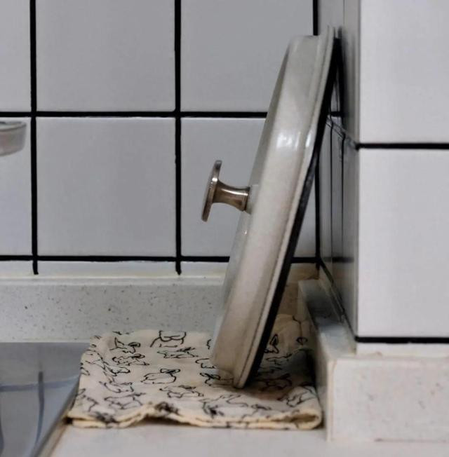 我妈根本不用任何锅盖架。她只用个抹布,把抹布挂在灶台旁边的墙角,然后把锅盖放在上面,靠墙一靠,稳得很。 起初我担心会滑,可实际上,锅盖放得稳稳当当,不会掉。