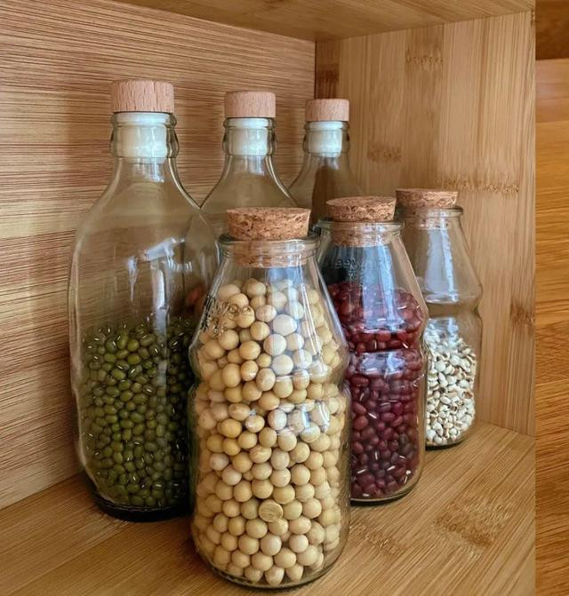 第九、五谷杂粮,用“旧瓶子”变收纳! 我买了专门的五谷杂粮收纳盒,颜值不错,但花钱太多(动辄上百)。 我妈只用平时喝苏打水的玻璃瓶子,洗干净后,用小木塞密封,装上各种干货,既环保又省钱。